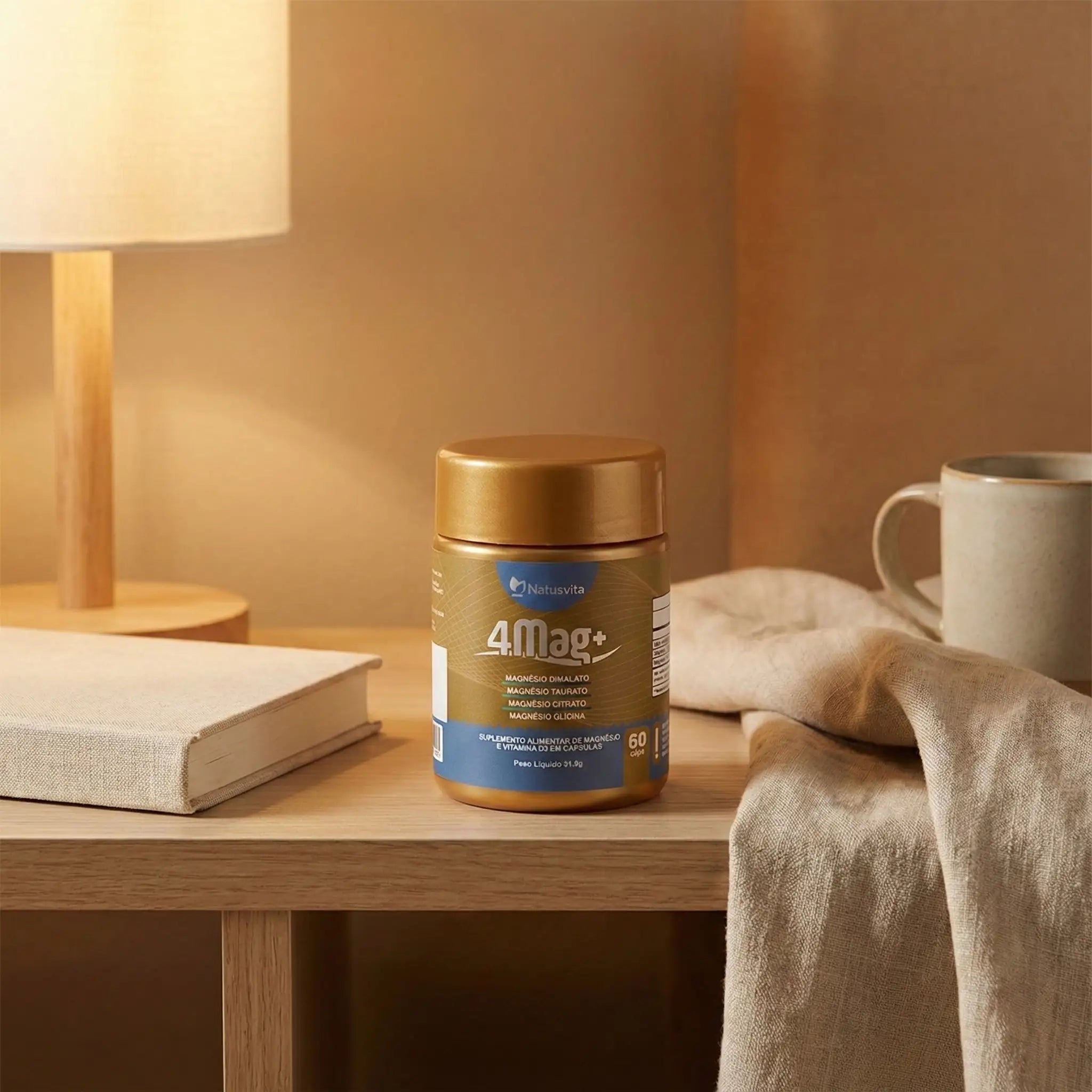 Suplemento com quatro fontes de magnésio: Citrato de Magnésio, Magnésio Dimalato, Magnésio Glicina e Magnésio Taurato e ainda Vitamina D3. Cada frasco contém 60 cápsulas.