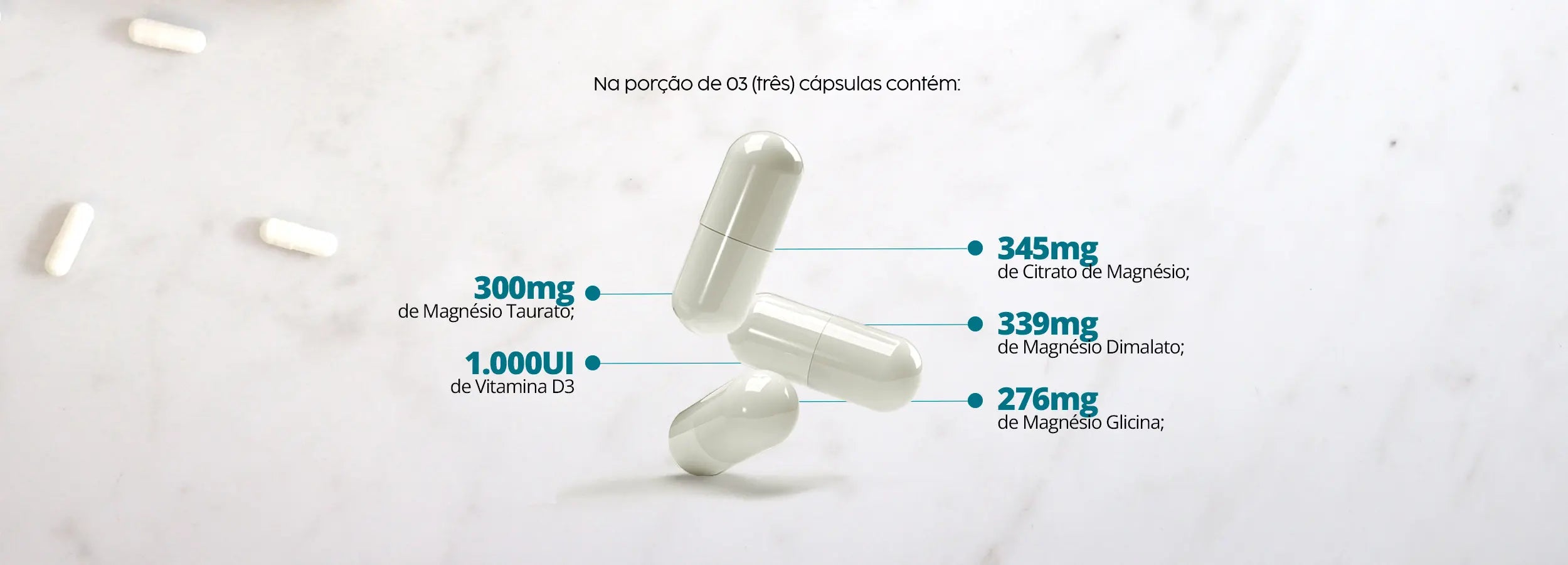 Citrato de Magnésio, Malato de Magnésio, Taurato de Magnésio, Bisglicinato de Magnésio e Colecalciferol (Vitamina D3). Composição da cápsula: Gelatina (INS 428), Dióxido de Titânio (INS 171) e Água.