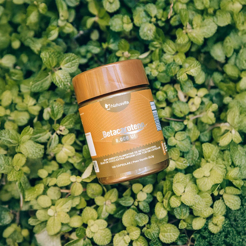 Suplemento Alimentar de Betacaroteno em cápsulas. Cada cápsula oferece 8.000 ui de Betacaroteno (carotenoide precursor da vitamina A)