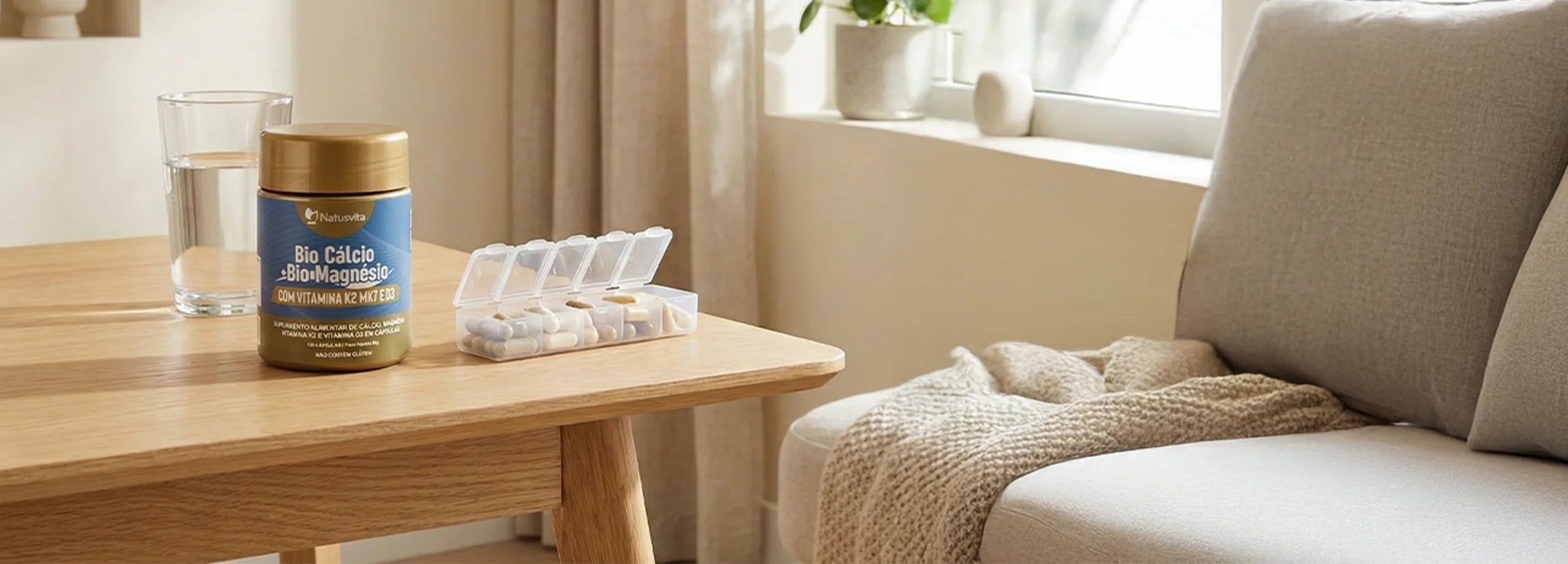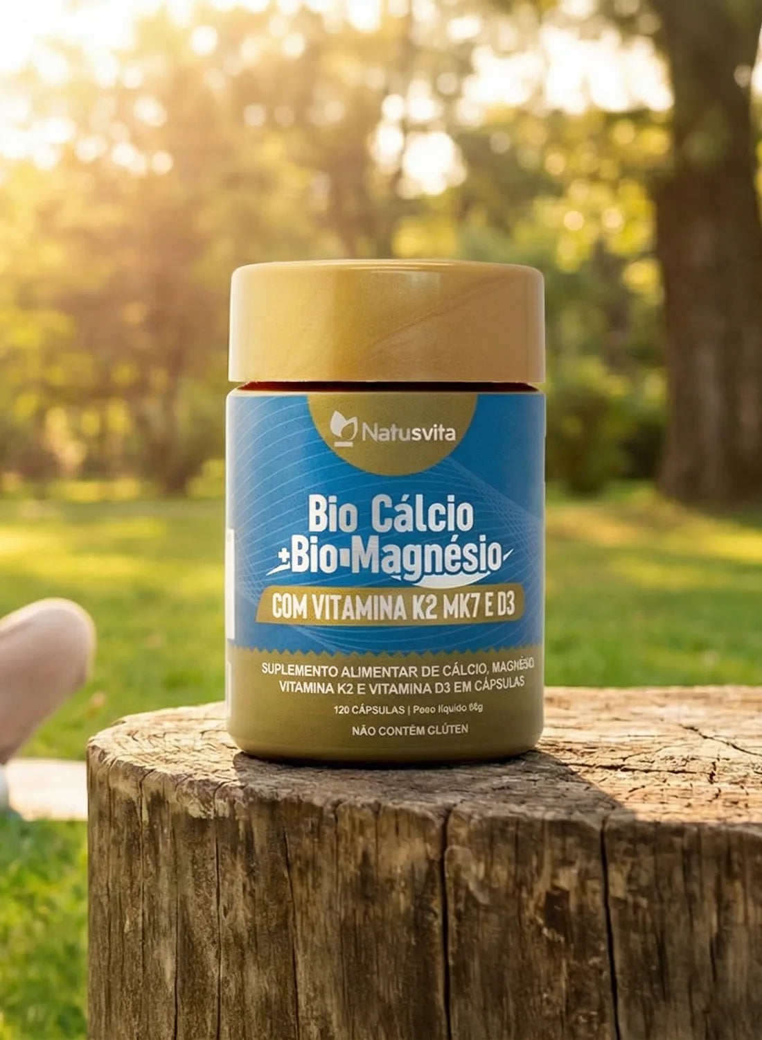 Suplemento nutricional composto por Cálcio orgânico, Magnésio quelato, Vitamina K2 (MK-7) e Vitamina D3 (Vitaminas Ativas).