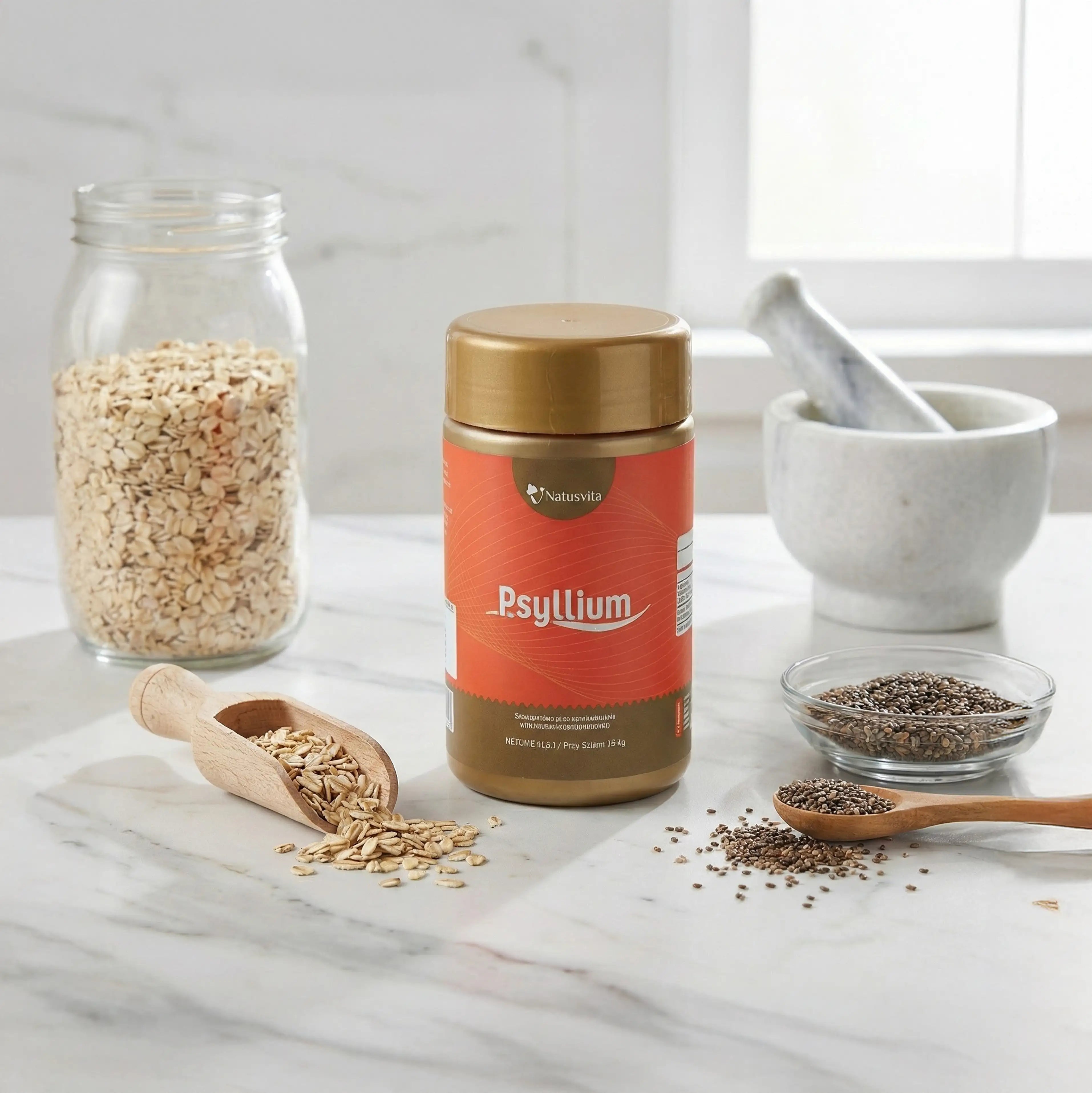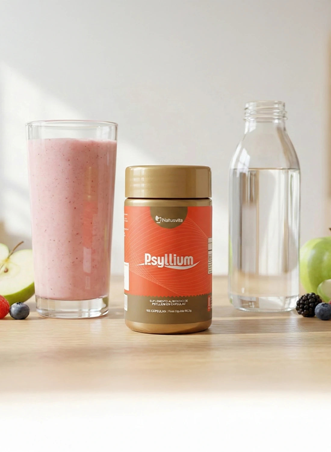 Psyllium em pó e Antiumectante: Fosfato tricálcico (INS 341ii). Composição da cápsula: Gelatina (INS 428), Dióxido de titânio (INS 171) e Água.