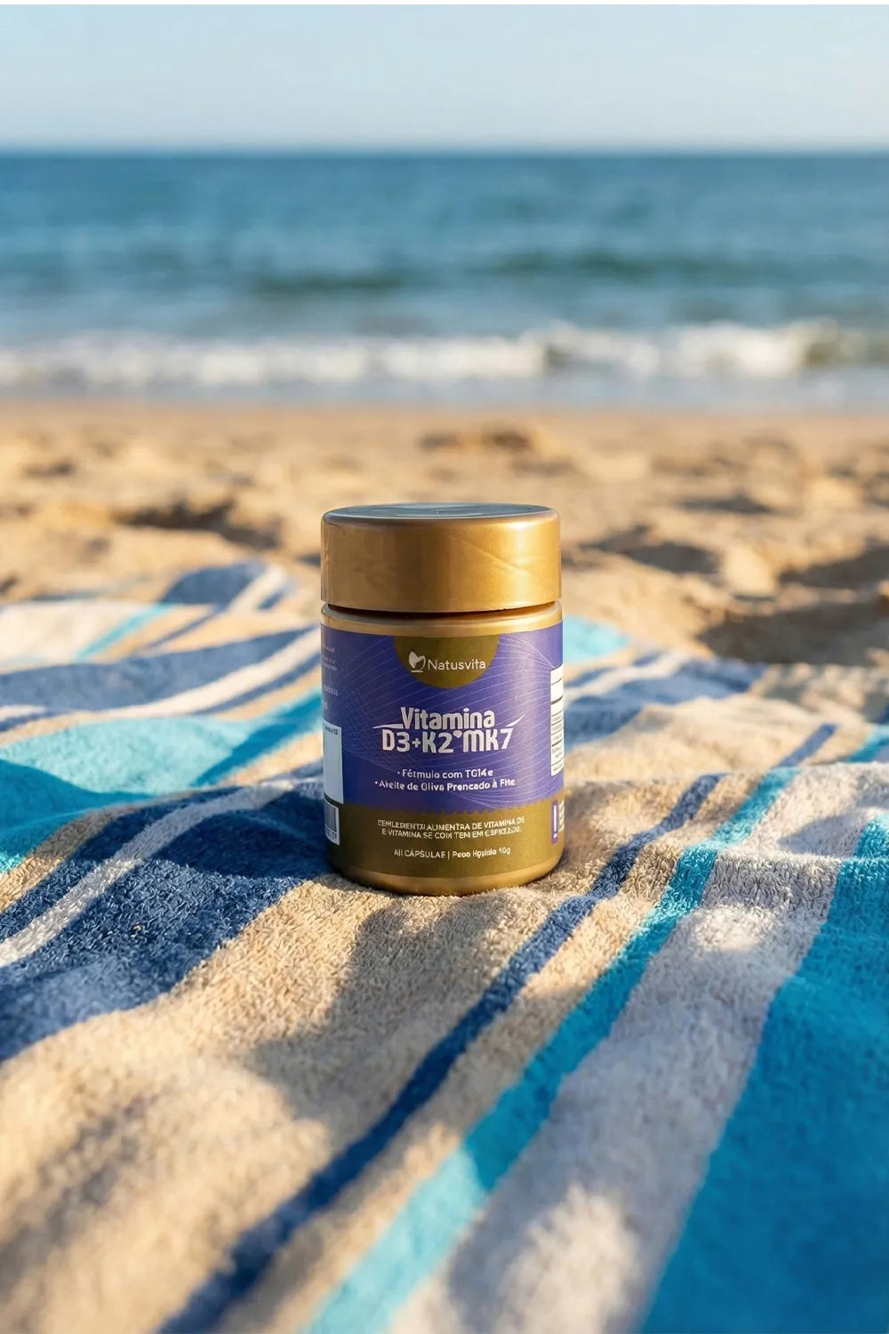Suplemento alimentar de Vitamina D3 2.000UI e Vitamina K2 MK7 em cápsula. Nossa Vitamina D3 + K2 combina duas vitaminas essenciais em uma base de TCM (Triglicerídeos de Cadeia Média) e azeite de oliva prensado a frio.